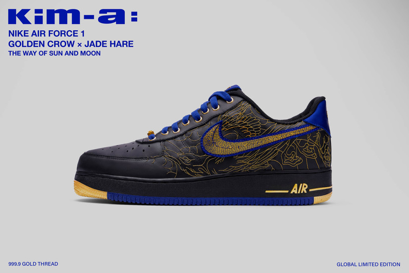本次創作靈感取自古老神話「金烏 × 玉兔」。在東方傳統中,三足金烏象徵太陽,燃燒無盡能量並不斷前行;棲於月宮的玉兔則代表寧靜、守護與重生。日與月、黑與白、動與靜,共構宇宙韻律,體現陰陽相生、循環不息的哲思。kim-a: 將此意象融入 Nike Air Force 1 經典鞋款,使鞋履不再只是運動或潮流的載體,而成為文化與工藝的承載者。