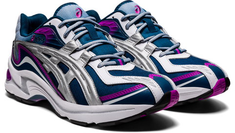 全新推出 GEL-PRELEUS 系列,運用變形蟲特徵作為設計發想,外型自雲層的自由流動中汲取靈感,而此系列一大亮點便是波浪狀的外型和色彩豐富的配色,讓整體潮流感更為強烈!主打色以神祕紫配上深靛藍的豐富色彩運用,帶出復古卻又科技感十足的特色,為復古跑鞋風潮注入都會與前衛時尚感。