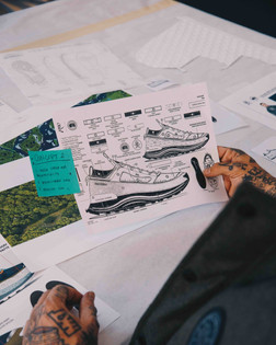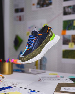 在鞋面處採用品牌設計中常見的經典 3M 織帶,鞋面處使用羽絨絎縫填充。包裹著運動鞋的是深橄欖色可撕破尼龍布料,地形刺繡圖案寓意著探險者前行探索的過程。經過磨損後,尼龍布料會慢慢脫落並露出白色壓花 SURGEON 皮革,為運動鞋揭開新的生命。