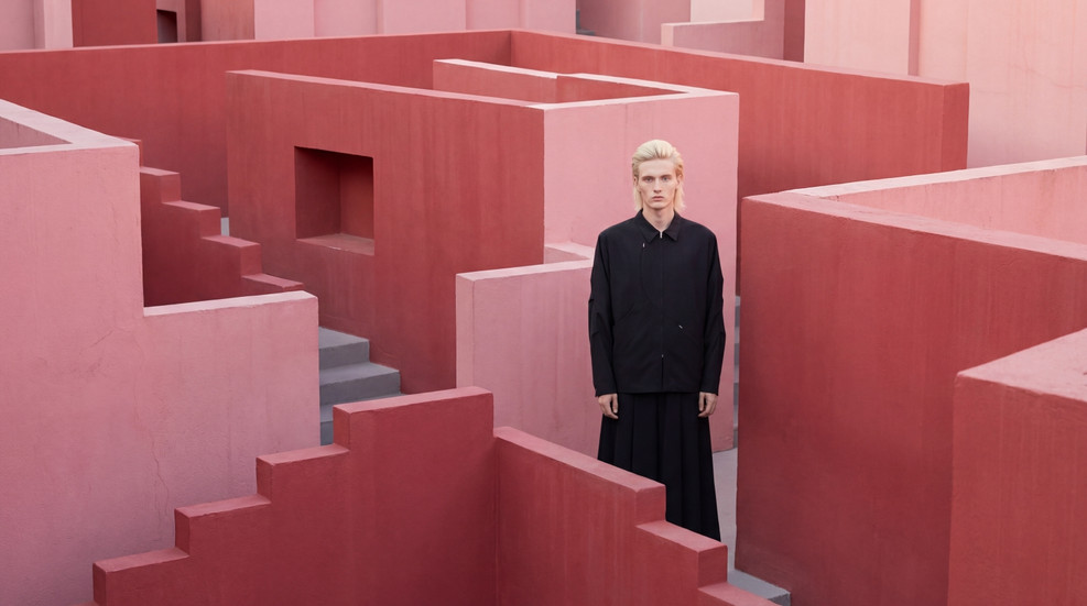在超現實主義的視覺邏輯與電影蒙太奇語法之下,透視被拆解,比例被改寫,尺度在斷裂與重組之間游移。當空間不再穩定,身體成為唯一的穩定核心。模特穿梭於被組裝的場景之中——有時重複、有時遮蔽、有時懸置於不同建築層次之間——但服裝的結構始終清晰。