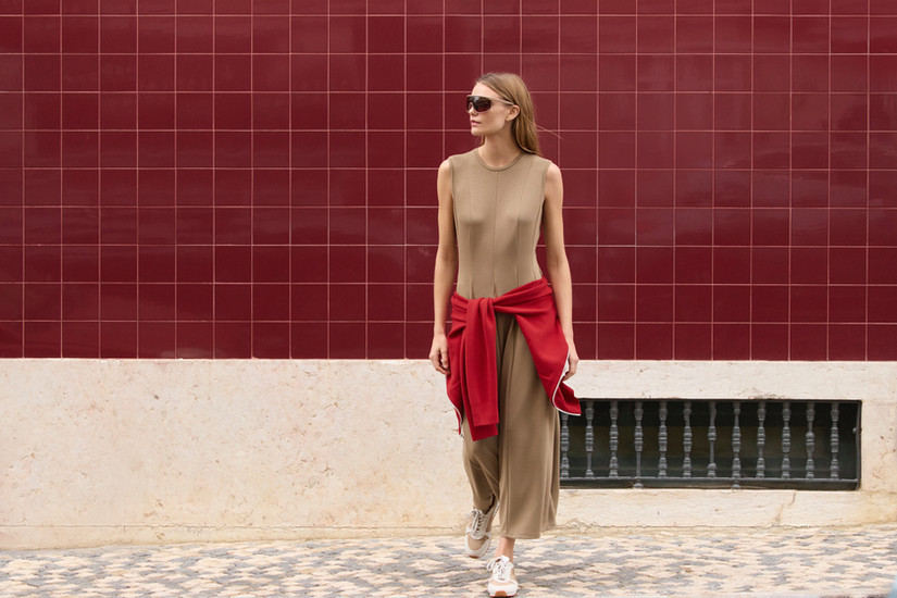 色彩運用上,柔和的粉紫色與天空藍為整體系列注入輕盈氣息,同色系的俐落剪裁單品,搭配明亮紅色針織單品,形成富有層次的視覺對比。系列中亦融入多款季節性單品,例如棉質澎袖洋裝以夾扣腰帶細節點綴造型,展現柔中帶剛的設計語彙;另外成套緞面設計、適合早春的柔滑棉針織衫以及米蘭羅紋針織單品,兼顧穿著舒適感的同時,亦提升春夏穿搭的多樣性與精緻細節。