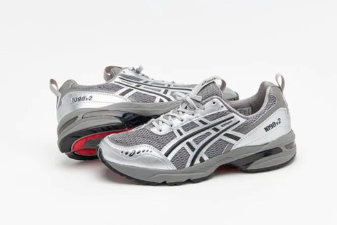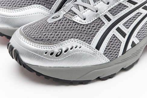 雙方以GEL-1090 V2 鞋型為藍本展開合作,鞋面採用頗具復古未來感的金屬質感加網眼設計與搭配黑紅大底,以整體風格簡約大方,很好地迎合時下大部分年輕人的審美追求以及穿搭適配性。