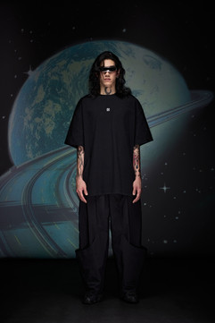此波段延續 “Lost in the Spectrum",結合近年的大勢走向相關題材 —— 元宇宙以及數位元素,透過極簡設計注入作舊工藝搭載寬鬆廓形,頻繁使用皺摺或是跳脫常理的線條設計以此展現獨特氣質與審美;也在此主題系列中具現化打破原有設計常規,超越現實界限的下身單品:以不規則向下延伸褲身線條與層次豐富的洗水工藝所演化出的 Dimension Jeans;如流水般的環繞弧形剪裁搭載非對稱出芽工藝的彎刀褲 Machete Pants。