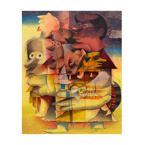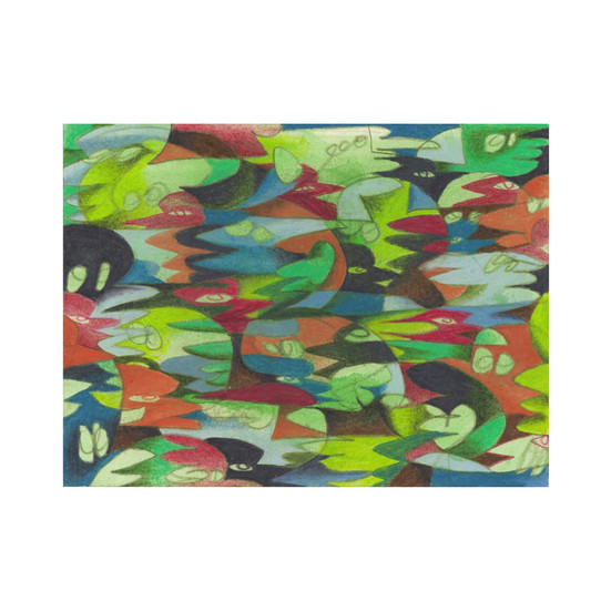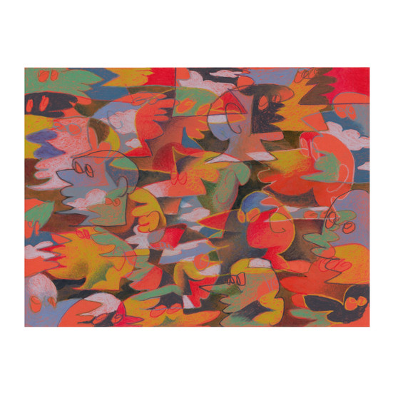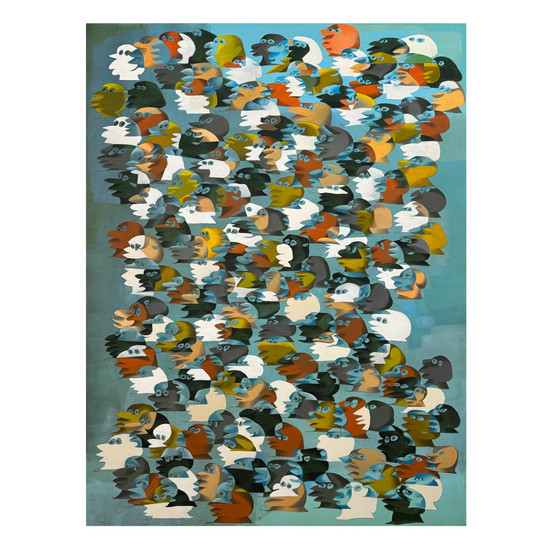 重要作品包括 Bulls Eye Spirit Level——直面人工智慧對動畫產業的威脅,是一次對人之手的堅定宣示;以及 Relationship to a Structure——洛杉磯野火肆虐期間,Froelich 坐在廚房餐桌前創作這幅密集交疊的面孔,手機不斷跳出撤離警報,窗外煙霧逼近。靈感脈絡上,他深受西班牙跨媒材藝術家 Javier Mariscal 鬆弛而多元的創作方式啟發,亦承繼2000年代初期極限運動文化中那批怪異而美麗的角色插畫傳統。好奇心,是他希望每件作品留給觀者的第一印象。