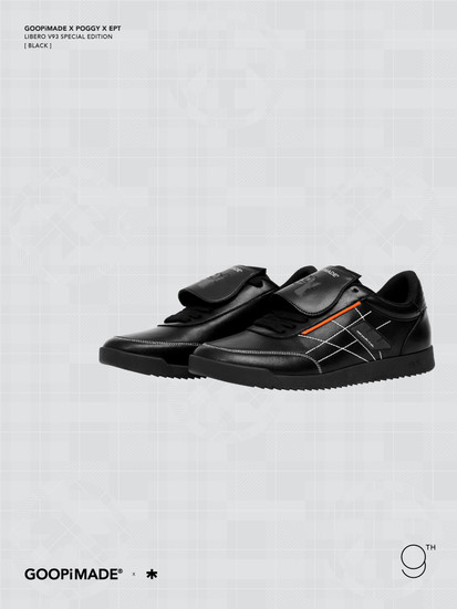 慶祝 GOOPiMADE 迎來九週年的里程碑,本次特別攜手日本潮流指標 POGGY 與韓國新銳鞋履品牌 East Pacific Trade(EPT),以經典鞋款 Libero 為基礎,三方聯名打造別注版本 Libero V93 Special Edition。靈感源自足球場上的「自由人」角色,象徵自由穿梭與掌控節奏的精神,呼應「Out of Circles」主題所傳遞的突破與無界理念。鞋款結合皮鞋的紳士質感與球鞋的舒適機能,採用可拆式鞋舌印有三方 Logo,搭配橘色繩帶與 EPT 立體反光標誌,後跟「木」字刺繡呼應聯名象徵,並以 Ortholite® 四層式鞋墊兼具支撐與柔軟,展現正裝與街頭語彙的完美融合。