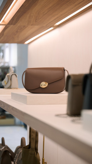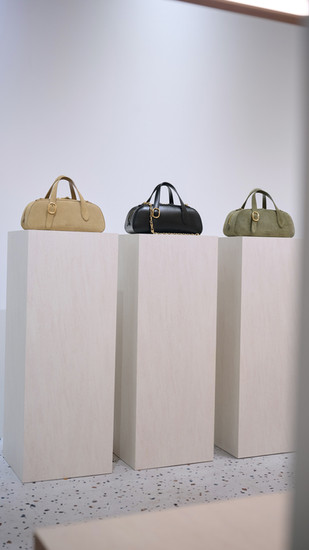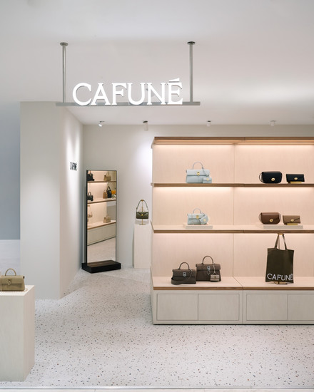 空間以溫潤的米色石材紋理為基底,搭配木質櫃體,營造出沉靜且富有層次的氛圍。店內陳列著春夏包款,包括柔和清新的晨露藍色與溫潤的幽苔綠色包包,營造出大自然靜謐的氣息。Cafuné 藉此傳遞對自然美學的嚮往,透過精湛工藝與純淨色彩,賦予每一件作品恆久的生命力。